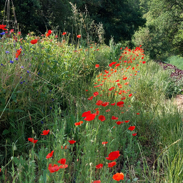 Les lignes de cultures cotoient ces lieux où le jardinage se fait plus spontané et léger, pour laisser place à l’observation, et à la découverte.