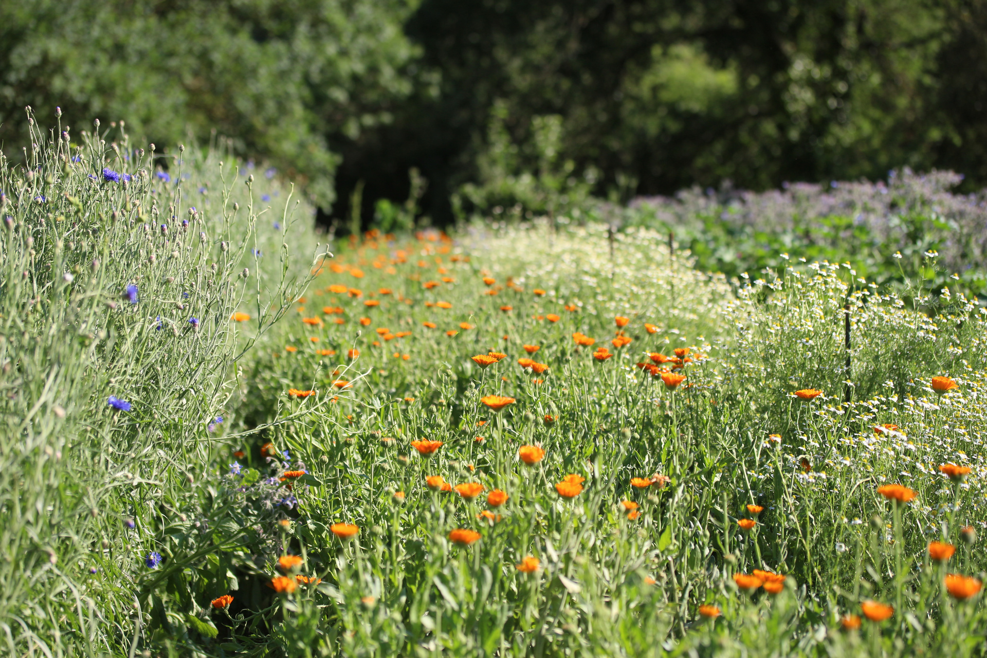 Nous y cultivons des plantes annuelles, un peu plus gourmandes en eau, dont beaucoup produisent des fleurs : calendula, bleuet, camomille matricaire, mauve… mais aussi différents basilics, ou de l’ortie.
